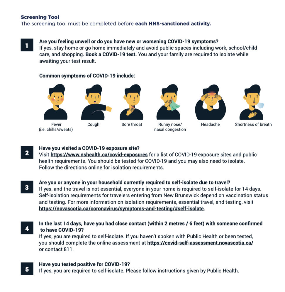 Players are asked to arrive no earlier than 30 minutes before their ice time, check in with the Safety Person in the lobby, put their name on their water bottle (no sharing!), wear a mask when they are not on the ice, and stay home if they are feeling unwell. For the most up to date information on Covid requirements for hockey see the Hockey Nova Scotia website.