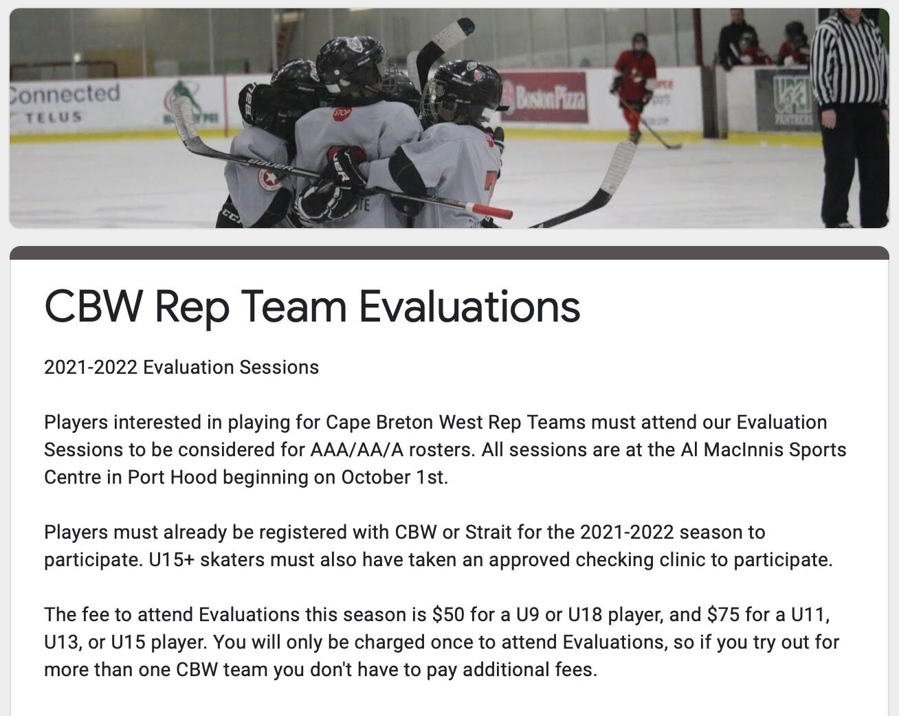 To try out for a Cape Breton West Rep Team you will need to register for the Evaluation Sessions for your age group and make your payment by e-transfer.